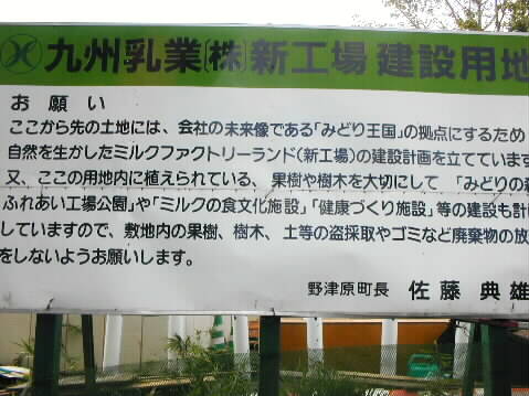 こんな看板にぶつかりました。我が家も毎日お世話になっている牛乳の工場がここに新しく建設中です。 自然を生かしたミルクファクトリーランドにしたいと書いてあります。この工場のできている場所は、以前は確か梅林などが広がっていました。 |