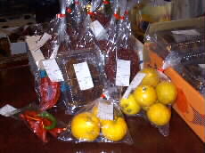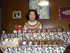 | 夜は友人の家に持ちよって、点検、値札つけなどをしました。農家の友人は、自家製の干し柿、カボス、ゆず、小豆、唐辛子などを売りたいと持ってきています。 さあ、明日はたくさんのお客様に来てほしいですね。 |  |