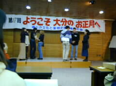 |  In the hall are two banners, written in English and Japanese that read "Welcome to Oita in New Year: the 17th homestay program."