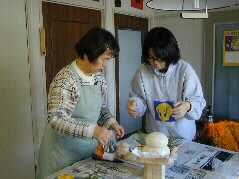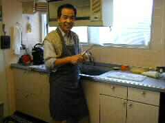 |  | ストーブの上では黒豆が煮えています。ガスコンロの上はきんとんにするサツマイモを煮ています。 夫は「男の料理教室」で習ってきた腕をふるって、お節料理の一つ、菊花大根を作ってくれました。 |