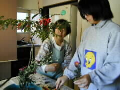 | お正月のお花を生けました。南天や菊を使ってリリアンさんも生けてみました。 |  |