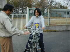 | ちょっと休憩、自転車に乗ってみたいというリリアンさんですが、まだ難しそうです。香港では自転車の必要もないそうで、乗れないんだそうです。 忙しい暮ですが、リリアンさんが来てくれて楽しい時間が過ごせています。 |  |