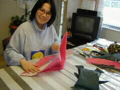 | リリアンさんが何か手遊びを始めました。鶴と亀を折りました。あまり素敵だったので大きな紙で折ってもらいました。とても立派なおめでたいお正月の飾りが出来上がりました。 |  |