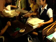 |  | 全体での打ち合わせ、そして男性と女性に分れての打ち合わせと準備をしました。 女性の方は、音楽祭期間中の出欠確認、各パートの責任者と仕事の再確認をしました。写真は買い物袋に音楽祭のスタンプを押す作業をしている所です。 さあ、明日から音楽祭を楽しみながら働きましょうと別れました。私たちは、例年泊めて頂いている「かなかな亭」に行きました。 |