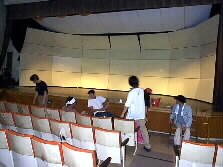|  | 音楽祭スタッフの男性は、朝の10時半から、ステージの反射板立てをしました。毎年の作業でとても手際良く組み立てていきます。これで素敵な音が会場に響き渡る訳ですね。 |