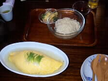|    お店の方のお勧めで、軽い冷麦と、2人前あるというオムレツにしました。オムレツは、フワフワの卵の中には地鶏ご飯が隠れています。上に飾った芽ネギがフアーと口の中で爽やかな香りを放ちます。まわりの薄味のスープが卵ととてもよく合っておいしかったです。 | |