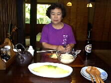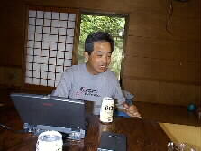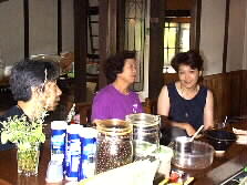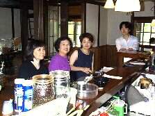 |  | 食事の終わる頃、電話で呼ばれました。友人の吉本さんが、「ことことや」に着いたとのこと。早速、行ってみましたら、音楽祭実行委員長の加藤昌邦さんと楽しくおしゃべり中でした。 吉本さんはこの3月まで、シリコンパレーに住んでいた私たちのインターネットフレンドです。昨年はサンフランシスコを案内してもらった。4月から山口県立大学の助教授です。音楽祭のボランテイアとして湯布院入りです。 |