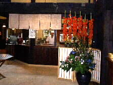 |  | エントランスからぱっと赤いほうずきが目に入りました。その向こうは、あゆを焼いたり、お肉を焼いたりするオープンキッチンになっています。おいしそうな豊後牛がたくさん並んでいました。 |