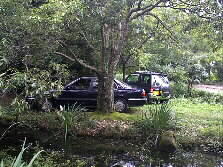 |  | 「かなかな亭」に落ち着きました。縁先の池の大きなコイも気持ち良く迎えてくれました。 吉本さんのパジェロと我が家のアコードが並んでいます。 |