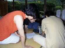 |  | 夜、7時から演奏家の宿舎の「田名加」に行きました。続々と演奏家、遠方からのボランテイアスタッフも到着なさいます。そして早速、ノートパソコンを取り出して、演奏家のリハーサルのプログラム組みなどをしています。 左は、ピアニストの河野美砂子さん、右は、カザルスホールのステージプロジューサーの蓑口一美さんです。 |