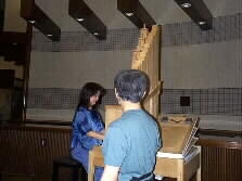 今日のゲストはポジテイブ・オルガンの福田のぞみさんです。今は練習中です。側に立っている須藤さんは、右側に見えるオルガンのふいごを操作して四角柱の管に空気を送りこんでいます。奏者とふいごを扱う人との呼吸がピッタリ合わないといい演奏が出来ないのだとか。不思議な450年前の音色がします。