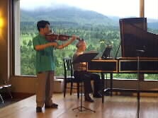 今日のゲストはヴィオラの松実健太さんです。バッハのソナタ第3番ト短調の美しい調べが夕暮れの山を背景に流れていきます。
