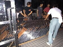 クラブハウスの2階の談話室を貸して頂いて会場を作ります。舞台を運び込み、チェンバロが置かれました。そして、設営担当の野々下さんと、チェンバロの調律をなさる中村さんの指揮のもと、椅子の配置が決まっていきます。