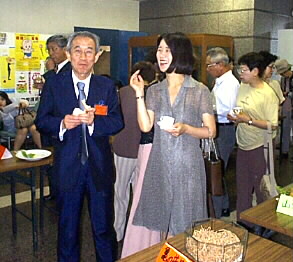 ドヴォルザークの弦楽五重奏の演奏が終わり、お客様がロビーに出てこられました。おいしいお菓子をつまみ、コーヒーやジュースを飲みながら楽しそうにお話をなさっています。右の写真は、音楽祭代表の溝口薫平さんと娘さんの桑野和泉さんです。