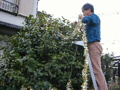 昨夜からの雨も上がりました。我が家も例年通りクリスマスツリーの準備をすることにしました。やっぱり今年も庭のシンボルツリーのツバキの木に飾ることにしました。 先ずは、木の形を整えてから、モールを飾ります。 |