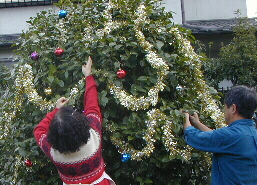| ミニ電飾は既にツバキの木を取り巻いて飾ってあります。 頂上に大きな星を飾り、次にガラスボールを吊り下げます。 |