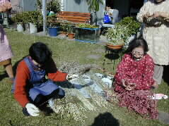 | あんまりお天気が良いので、庭で作業をしました。蔓は曲げて細い蔓をからませます。 レモングラスは少し彩りに染めたグラスを混ぜて三つ編みにします。 |