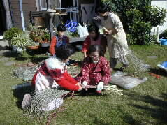 | 午後は部屋の中で、緑のホーリーの葉や赤い唐辛子、ホウヅキ、松ぼっくりなどをボンドで止めてリボンを飾ります。 | ![]() |