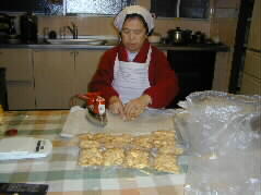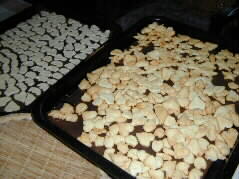 | 今日はまずチーズクラッカー作りです。 材料は、粉が1.4キロ、チーズが700g、焼き上がった時にはホッとしましたが、腰が痛くなってしまいました。 |