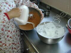 | 卵白3個分と白砂糖を70gしっかり泡立てます。 もう一つのボールには、すりおろしたニンジン120gに三温糖90g、シナモン小匙1.5杯、卵黄3個分、を入れて混ぜ、そこへサラダオイル120ccを少しずつ入れながらよく泡立てます。 |