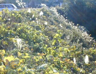 我が家の前の草の斜面は、ススキや葛が枯れてすっかり冬景色というのに、エンドウ豆は元気です。