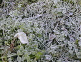 今朝の大分地方は今冬一番の冷え込みとなりました。朝8時、我が家の家の前の草には真っ白に霜が降りています。
