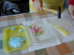 ![]() 色ガラスの代わりに色のきれいな飴を砕いて使います。 |