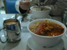 | 香港3日目の朝です、朝食は何がいいかな?と外へ出て入ったのは、昨日とはまた違って明るい若者向けの雰囲気のお店。昨日おいしそうにミルクティを飲んでた人がいた、今朝はそれを頼みたい。 | そう思っていたら、お茶の代わりに出てきたのがこの大きなカップのミルクティ、とってもおいしかった。朝食は中国麺、手前はちょっと辛い味でした。 |