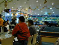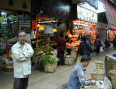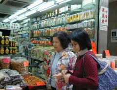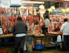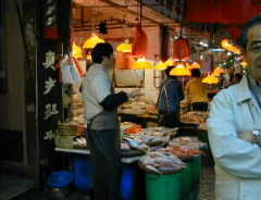 | 食後の散歩は市場の見学。まず上の写真は八百屋さん、右上は、肉屋さんです。何ともダイナミックですが、何軒かみるうちにちょっと平気になりました。 右の写真は魚屋さん。香港人の胃袋を満たす食料は全て中国から運ばれてきます。 |