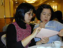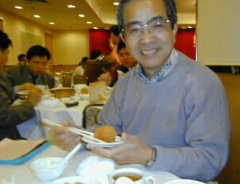 | 今日からガイド役を引き受けてくれるLillianはいろいろ計画を立ててくれていました。まず、ホテルの前のレストランで、、、、 | 飲茶の朝食の計画だったとか。 食べてきたばかりの私達もまたお相伴。ここはおいしいお店なんだそうです。 |