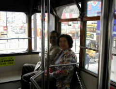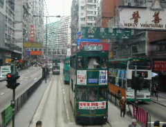 | さあ、乗りたかった二階建て電車の二階のまん前に乗っています。 | 対向電車がやってきました。香港名物の看板も電車の邪魔にならない高さに張り出しているんだと分かりました。 |