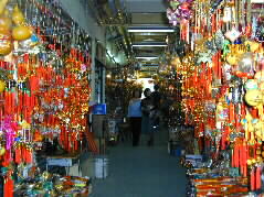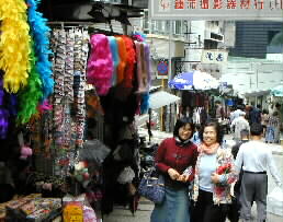 | 二階建て電車は中環(Central)で下車、香港の高層ビル群を眺めながら歩き、そして一つ路地を入ると細い坂道の両側に露天店の並んだ通りがありました。 | ![]() |
