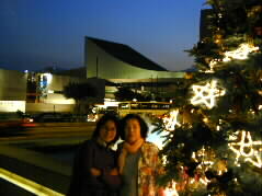 | 上はClock Tower of Old Kowloon Staition、45mの高さがある元九広鉄道駅の名残です。夕日が塔を染めています。 右上の写真は、香港サイト・ビクトリアピークに沈む太陽です。 右の写真は美しいペニンシュラホテル前のクリスマスツリーです。後ろの建物はアートセンター。この中の一室を借りてLillianは日本語のクラスを持っています。 |
