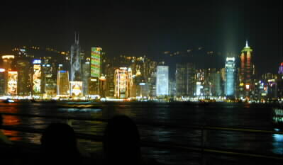 | 時計塔の前のチムサアチョイ・プロムナードは、対岸の香港島を見る絶好の場所になっています。 高層ビルには、赤や緑、青でクリスマスイルミネーションがとてもきれいでたくさんの人が見ています。この景色を見るために今の時期に香港へと言ってくれたLillianでした。 |