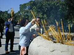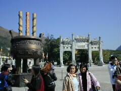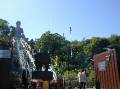 | We arrived at Po Lin Monastery. A tall gate and a large incense holder welcomed us. | A long steep stairway leads us to the Buddha statue. |