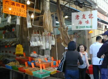 | Hong Kong Island is surrounded with sea, of course. But people can't eat fish taken in the water. Here in Tai O, however, water is clean and the catch is dried in the sun. It is really rare in those days. A large dried shark is hung down from the ceiling. | |