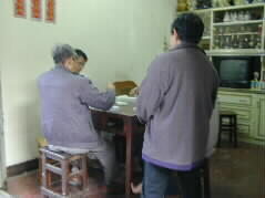 | We enjoyed strolling along a narrow pass of the village. Rattling noise lured me and I found people enjoying mah-jongg in the afternoon. Every house provides such altar to worship the house God. Red candles in front of the entrance and in-house altar represent the traditional way of life of Tai O residents. | |