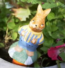 | We have had a very cold morning today. Mt.Yufu, visible from my backyard, was shining white at the top covered with the first rime on trees this winter. But the rime has melted away by the noon and the weather was getting warmer. Since I felt it was something wasteful to stay indoors, I drove down to a green shop nearby to find something good for gardening. I got some pansies to increase their number in my garden. I also found and bought a lovely water helper of rabbit on impulse. I have an E-mail couple who are leading a wonderful life with a lovely pet rabbit. As I have often heard about their rabbit, I got the ornament instinctively. |
