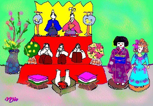 In the old days, on March 3rd simple hand-made dolls were thrown into the river along with offerings. Today gorgeous dolls dressed up in the "Heian" era kimono costume, and passed from generation to generation are decorated on this occasion. A male doll and a female doll are placed close to each other representing the wish for love.