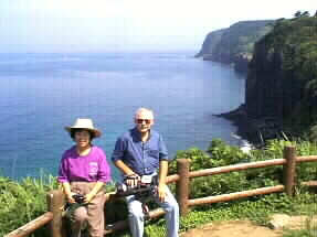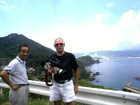 宮崎大学の竹井成美教授の書かれた「南蛮音楽、その光と影」という本の中の隠れキリシタンのことに大変興味を持ったジムさんは、いつかその人たちの住む「生月島」に行ってみたいと言いつづけていました。やっと今回それが実現をしました。薄く見える島が九州の西の果て、平戸側から眺めた生月島です。 |