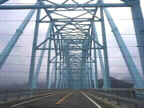 5年前に出来たという生月大橋で九州本土と生月島は結ばれました。水色のおもしろい形をした橋です。600円を払って渡りました。 |