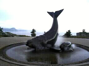 生月島に渡ってすぐに博物館「島の館」がありました。この中へ入ると島の暮らしや歴史がよく分かります。周囲を海に囲まれた生月島は漁業、それも捕鯨で栄えた島でした。博物館の入り口にはかわいい鯨の親子の像がありました。竹井先生が紹介をして下さった学芸員の方に詳しく隠れキリシタンのお話を伺うことが出来ました。特に伝承されているオラショ、歌オラショについて知りたかったジムさんは、ビデオで聞かせてもらって本当に良かったと話していました。 |