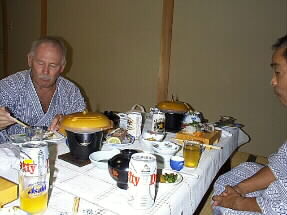 博物館の近くの高台にある民宿で泊まりました。海や漁港が見下ろせる素敵な所です。おいしいおさしみがいろいろ並んだ夕食を浴衣で楽しみました。ジムさんは浴衣がとてもよく似合ってます。 |