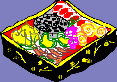 Traditional foods, each with a particular meaning, are packed closely together.