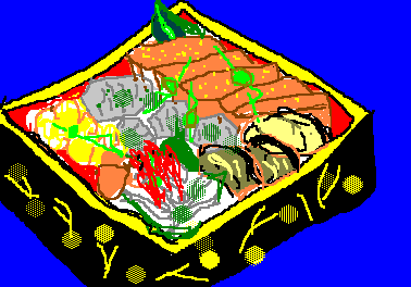 of yellowtail and oriental chicken patties. Grilled prawn in the shell is also served.