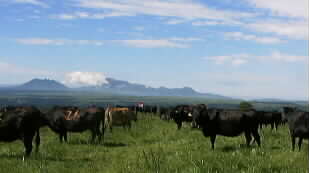 牧場には黒い牛がいっぱい、のんびりと草をはんでいます。