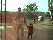 凧上げの親子、カイトですね、右はお正月休みのお店の張り紙。