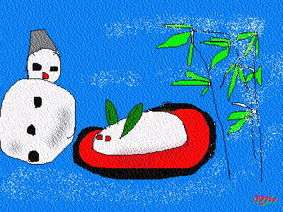 Mention Kyushu island of Japan, and the first thing that probably comes to mind is a land of moderate climate. People enjoys sunny days through the whole year and people are supposed to have never seen snowfall at all. We have, however, four seasons and distinctive transition of the climate. It goes up to 35 degrees C in summer, while drops down to sub-zero in winter.We even have occasional snow accumulation on the ground. On such days, children dash out to play with snow, delightfully gathering it to make big snow balls to prepare a snow man. They give eyes and a mouth to it using apples and stones, put an up-side-down bucket on the head as a cap. Lovely "snow rabbit" is one of children's favorites. They put a chunk of snow on a tray. They make eyes by red nuts of Nadine(sacred bamboo), ears by its green leaves.When play-tired children go to beds, the snow rabbit is also gone, probably into the moon to become the shadow on the surface. the Play Archives