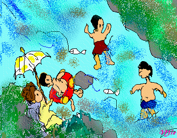 After the rainy season, a swimming season is now open. Children are very happy to go swimming in a nearby river together with play mates. They throw away clothes on the rocks of the river and jump into the water. Elder children can swim across the river floating on the stream. Small children splash about in the water close to the bank using rubber rings. Mothers are closely watching children by rotating parasols, holding the rubber rings, and taking care if anybody is out of sight.