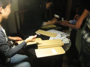 | そして、音楽祭のチラシを入れて、封筒に宛名を貼り付けます。封筒入れも、皆の共同作業というので驚かれています。 | ![]() |